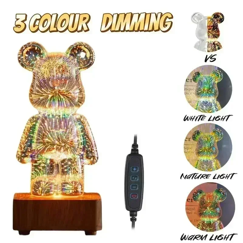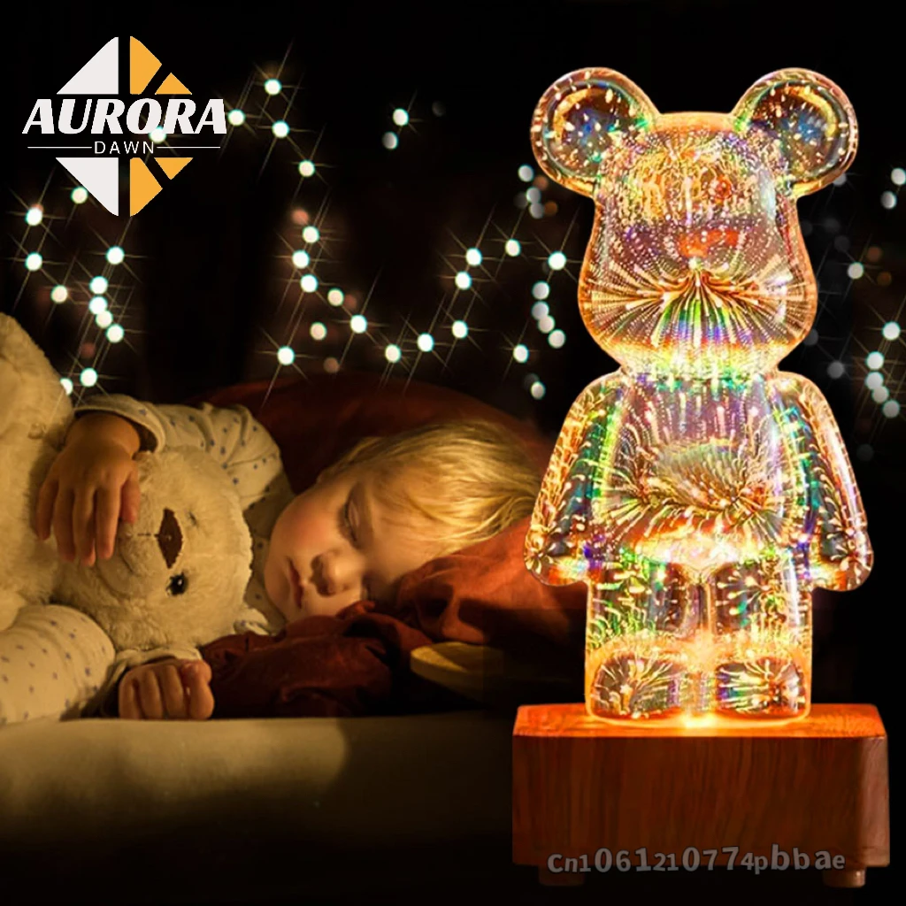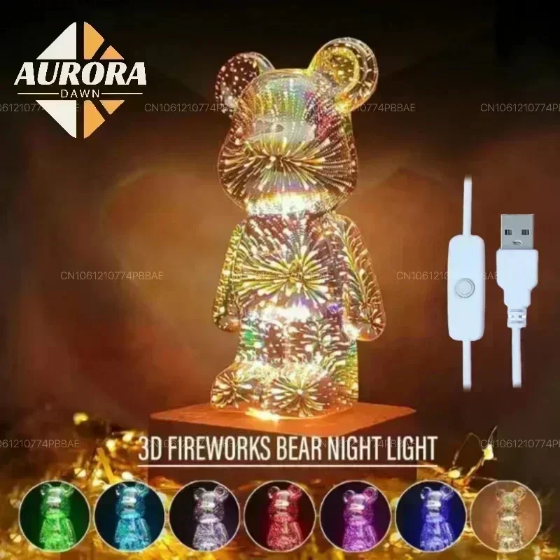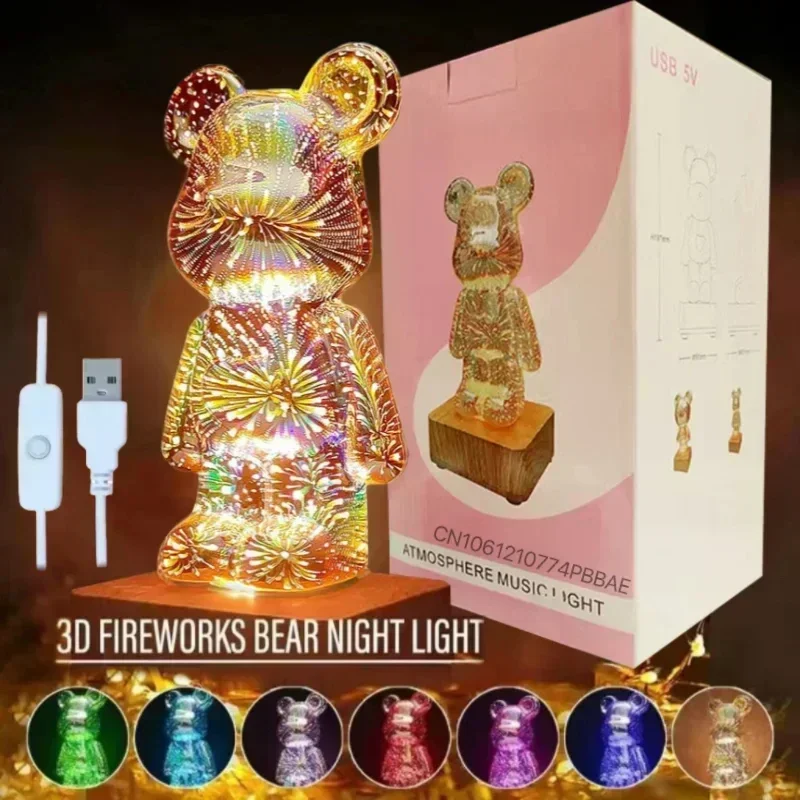 Bear Fireworks Night Light Usb Led 3d Glass Lamp Dimming Colorful Projector Cute Room Decor Bedroom Atmosphere Gift Decorative