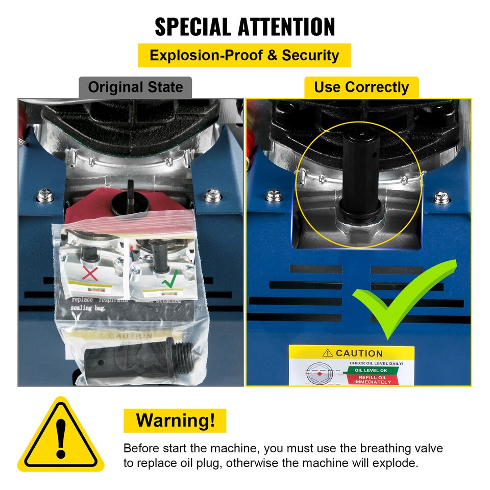 - Various Safeguard: The paintball compressor features an explosion-proof valve, front and side fences, providing you more security and avoiding secondary hazards caused by improper use. Attention: To avoid danger, you must use the breathing valve to replace the oil plug before running the machine.