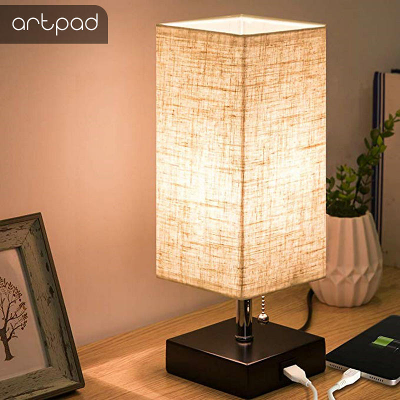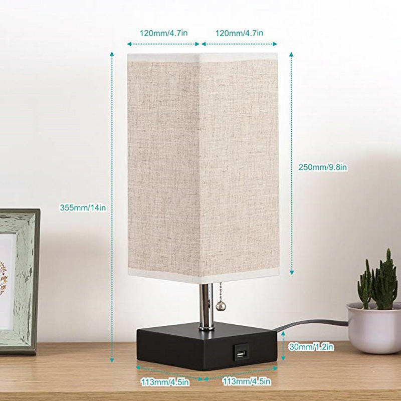 Modern Design Bedside Table Lamps with USB Charging Port Wood Base Fabric Square Nightstand Table Light Bedroom Study Lighting
