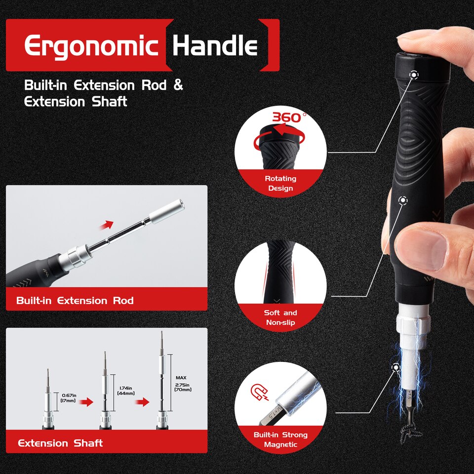 【Portable & Organized】With a professional and well-organized storage case, the placement position and the size of the accessories are consistent that stops them from falling out. Additionally, Integrated magnetizer and de-magnetiser and have suction cups, triangles, crowbars, flexible extension rods are all available, worry-free disassembly and assembly, easy storage.