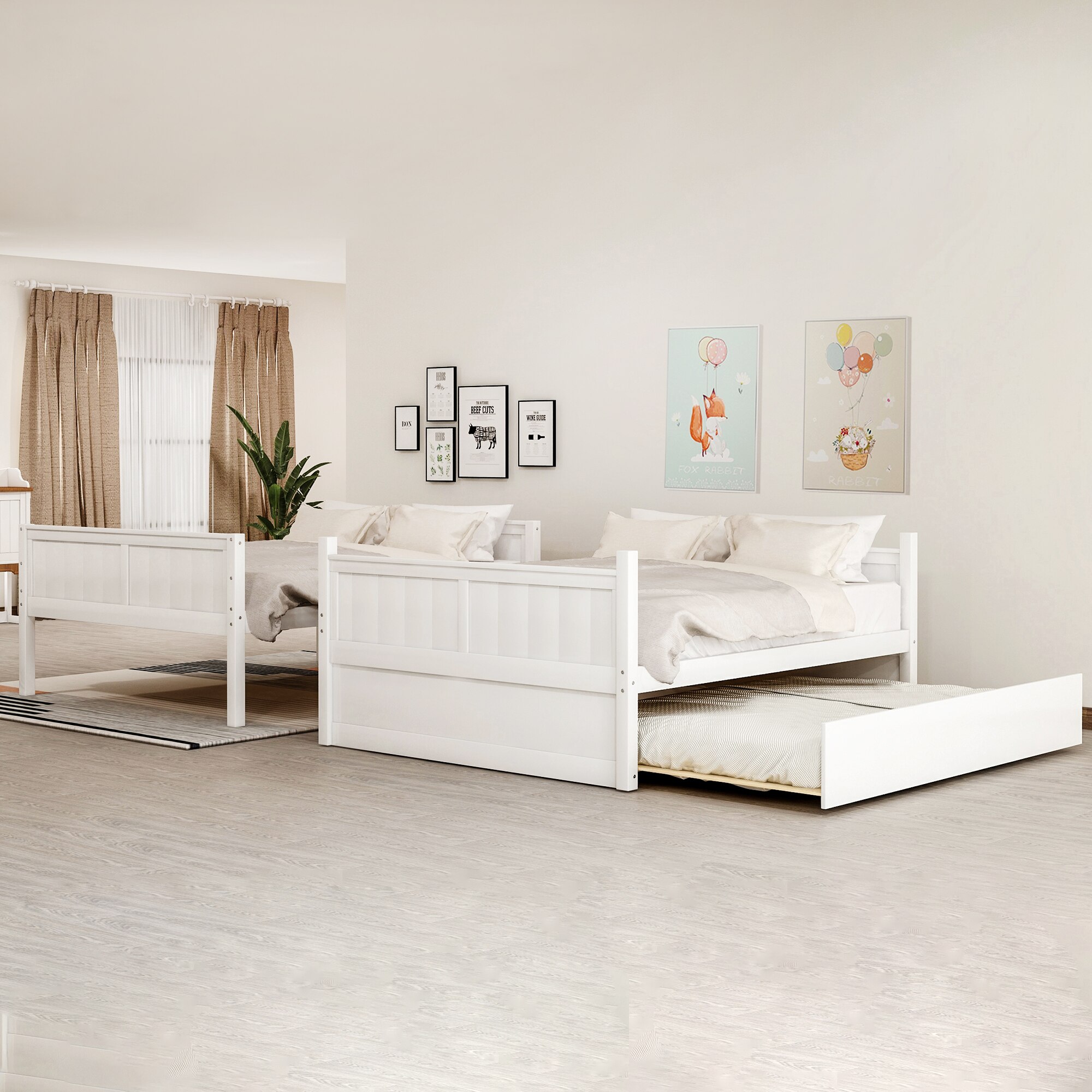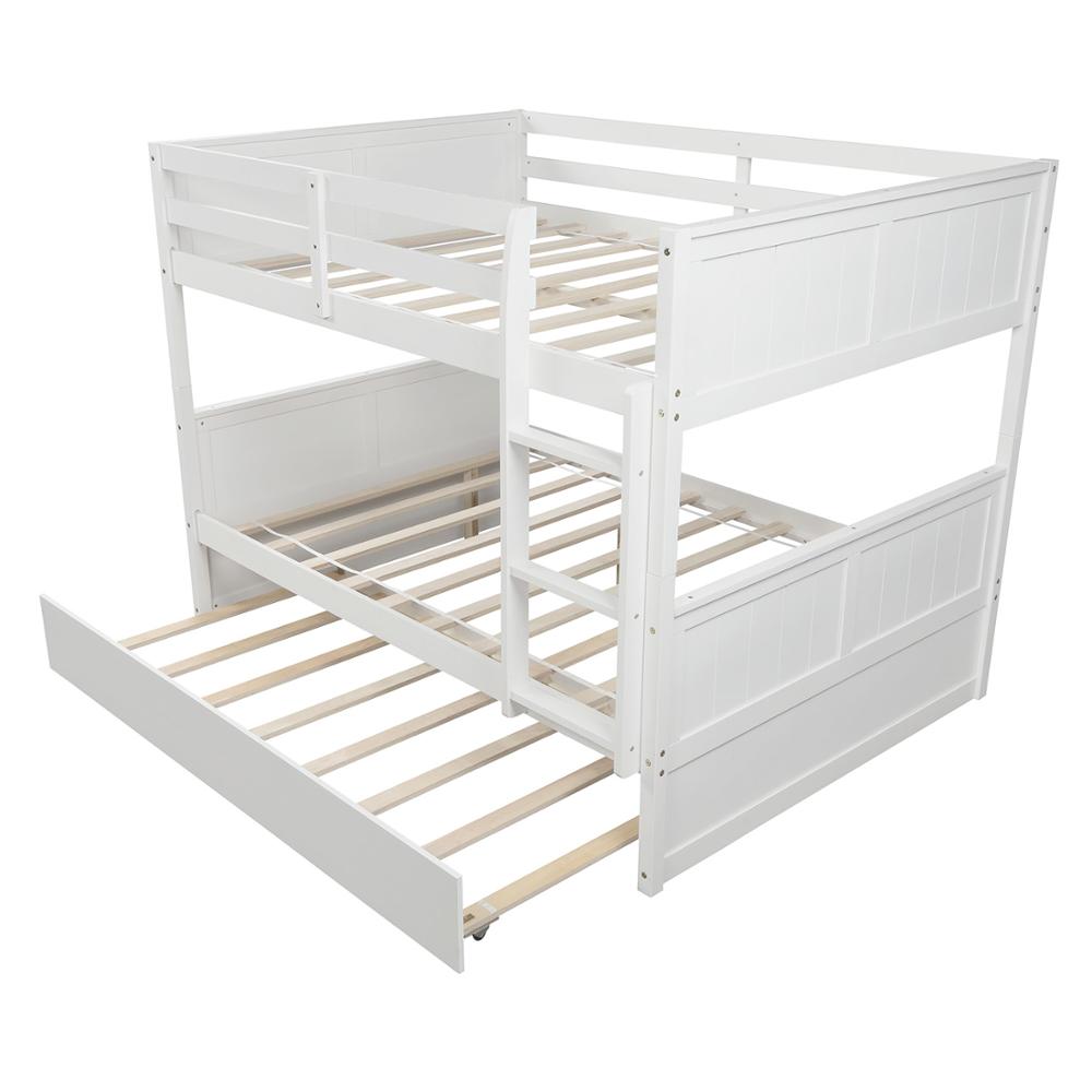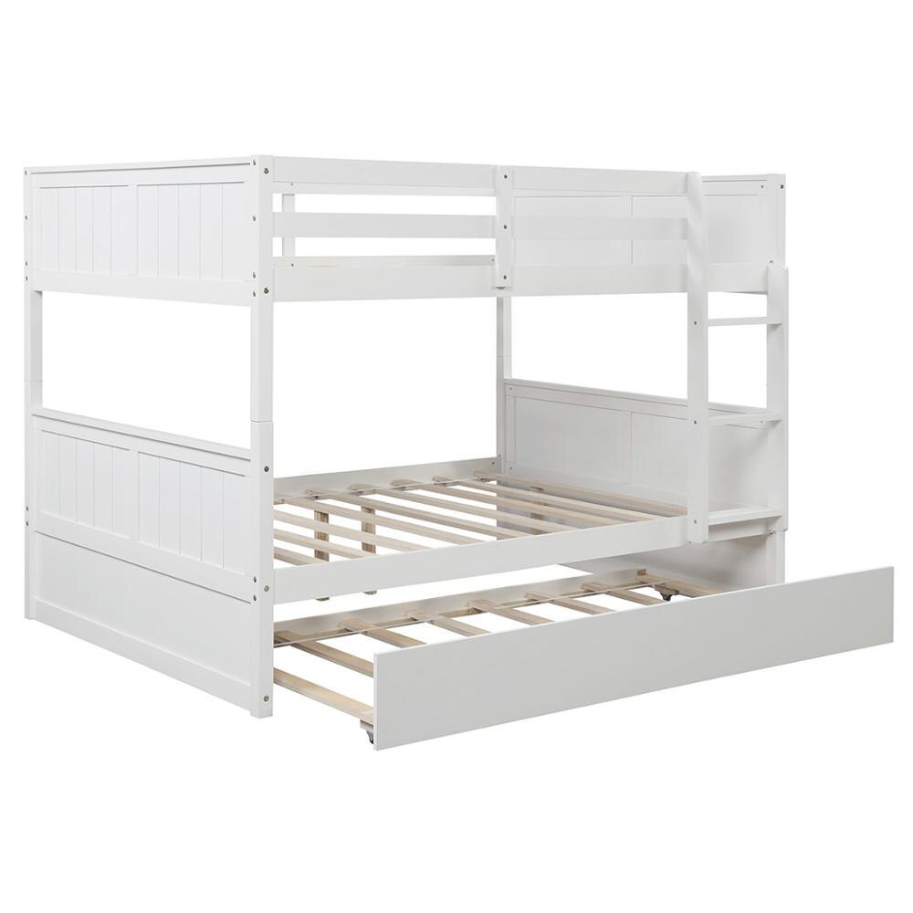 If you need extra sleeping space or your kids love sleepovers, this Full Over Full Bunk Bed with Twin Size Trundle is perfect for your home. The trundle under the bottom bed makes this piece a great option for sleepovers. High-quality, solid pine legs and a strong, durable frame ensures stability and durability for long-term use, and can be separated into two full-size platform bed. Slat kit included so box springs are not required. This bunk bed is designed with a clean silhouette and a hue of elegance. It suits all styles of home decoration, and completes the look of any bedroom.